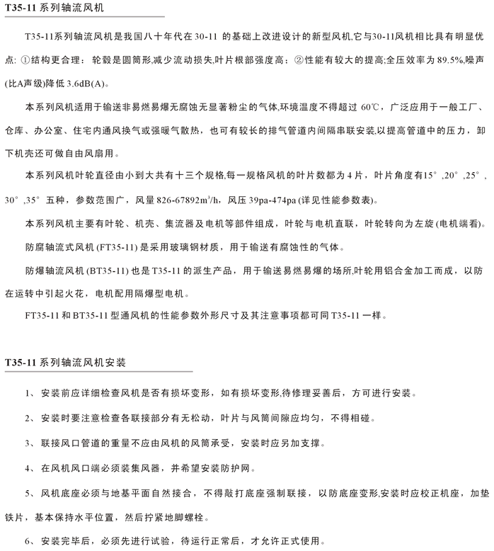 T35-11系列軸流通風機 該軸流風機是30K4型軸流風機的替代產品,根據需要也可改用防爆電動機,故可用作非腐蝕的含有易燃、易爆氣體的場所作一般用途的防爆通風換氣設備;可作為一般工廠、倉庫、辦公室、住宅等通風換氣或加強暖氣散熱之用。