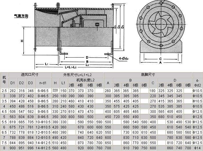 特點:錐形輪轂、進風口帶集流及弧形消聲器、壓力高、風量大、效率高、噪音低、體積小、配用雙速電機,可通過變速來調整風量、風壓
